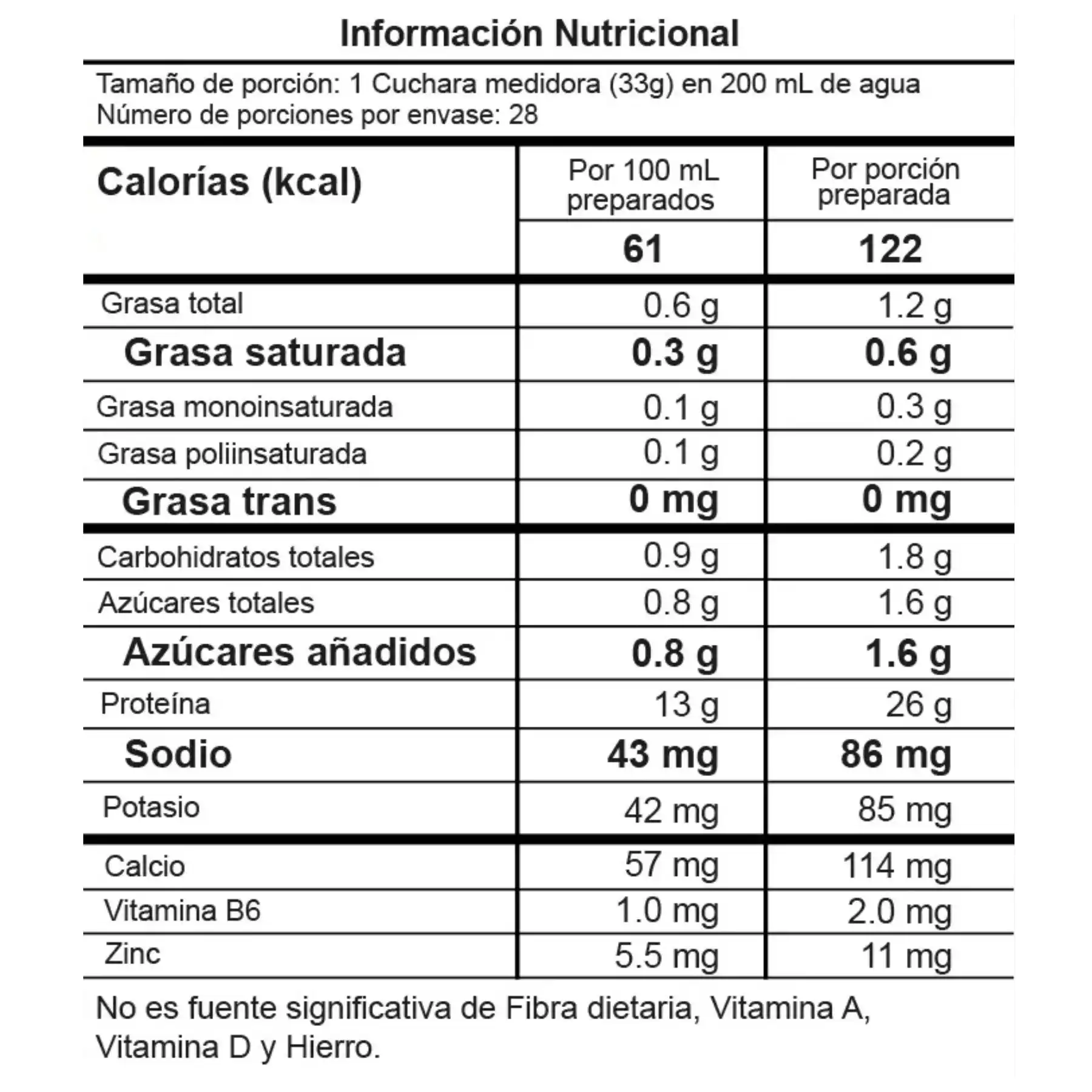 INGREDIENTES: Proteína Concentrada de Suero de Leche, Proteína Aislada de Suero de Leche, Saborizante Idéntico al Natural, Dióxido De Silicio (Anticompactante), Goma Xanthan (Espesante), Carboximetilcelulosa (Estabilizante), Lecitina de Soya (Estabilizante), Citrato de Sodio (Estabilizante), Lactasa en Polvo, Citrato de Zinc, Stevia (Edulcorante), Piridoxina (Vitamina B6).